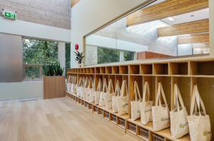A nature-inspired space with an organic garden, river-rock stream, natural light, and creative learning tools.